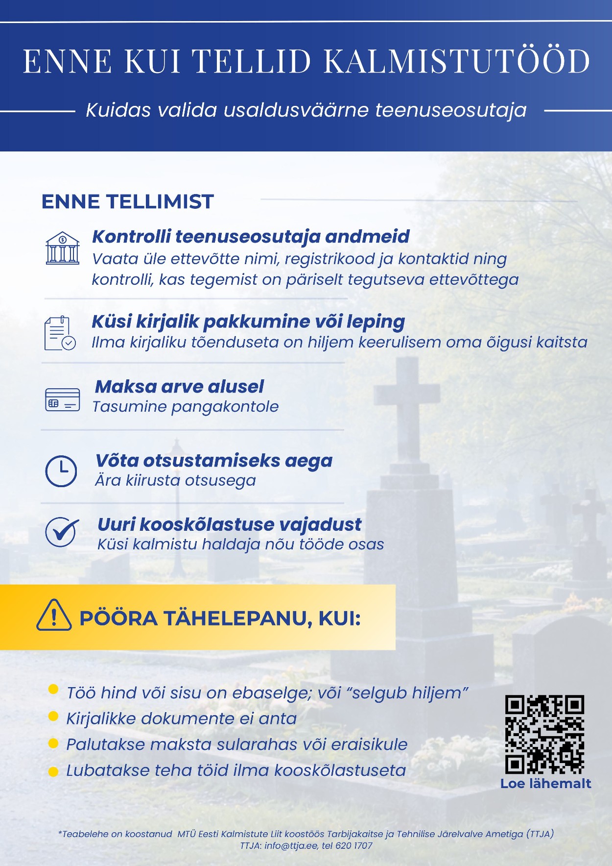 Kalmistutel toimuvad matmised, puudelõikused, hauakaevamised ja hauakujundused tuleb kooskõlastada vastavalt Eesti Vabariigi kalmistuseadusele kalmistu haldajaga. NB! Pelgalt haldaja teavatamisest ei piisa.