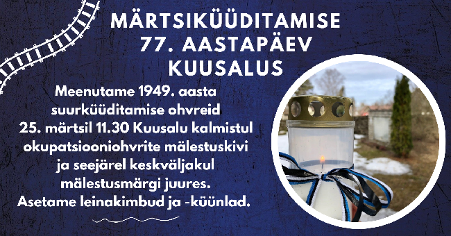 Meenutame 1949. aasta suurküüditamise ohvreid 25. märtsil kell 10.30 Kuusalu kalmistul okupatsiooniohvrite mälestuskivi ja seejärel keskväljakul mälestusmärgi juures. Asetame leinakimbud ja -küünlad.
