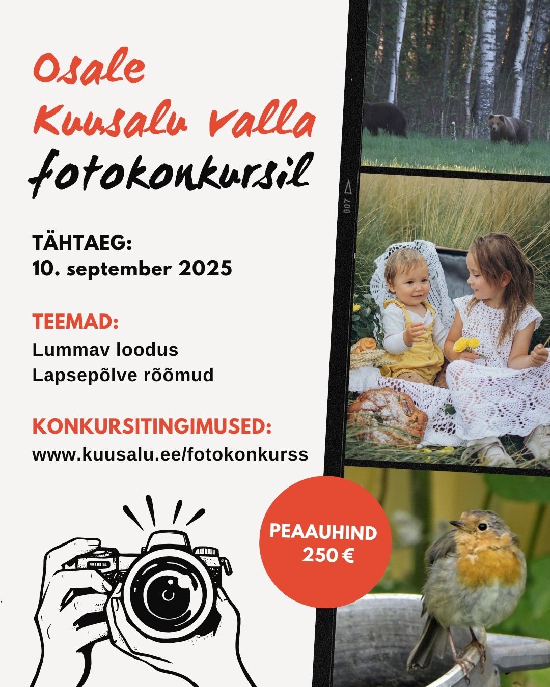 - Lapsepõlve rõõmud – laste ehtsad rõõmuhetked mängides, liikudes, uudistades, sõpradega lustides või lihtsalt hetkes olles (foto peab olema seotud Kuusalu valla inimestega).